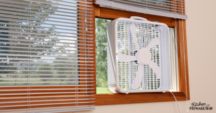 The easiest way to pull hot air away from your stovetop is to use the stove vent fan, also known as a range hood. Most of them exhaust the air outdoors, but some send it into the attic or simply blow it back into the house! (Here’s how to tell where your range hood is venting.) Unfortunately, my kitchen doesn’t have a stove vent fan–there’s a hood over the stove, but it’s just empty, with no vent!! So we’ve had to work with other options.
