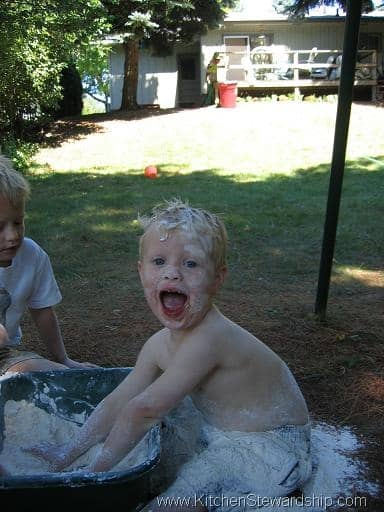 | 5. Dino-Flour Dig each child dug for a few M&Ms in oatmeal canisters filled with white flour (it was cheaper back then), and each group unburied a certain number of pennies in a dishpan of flour. |